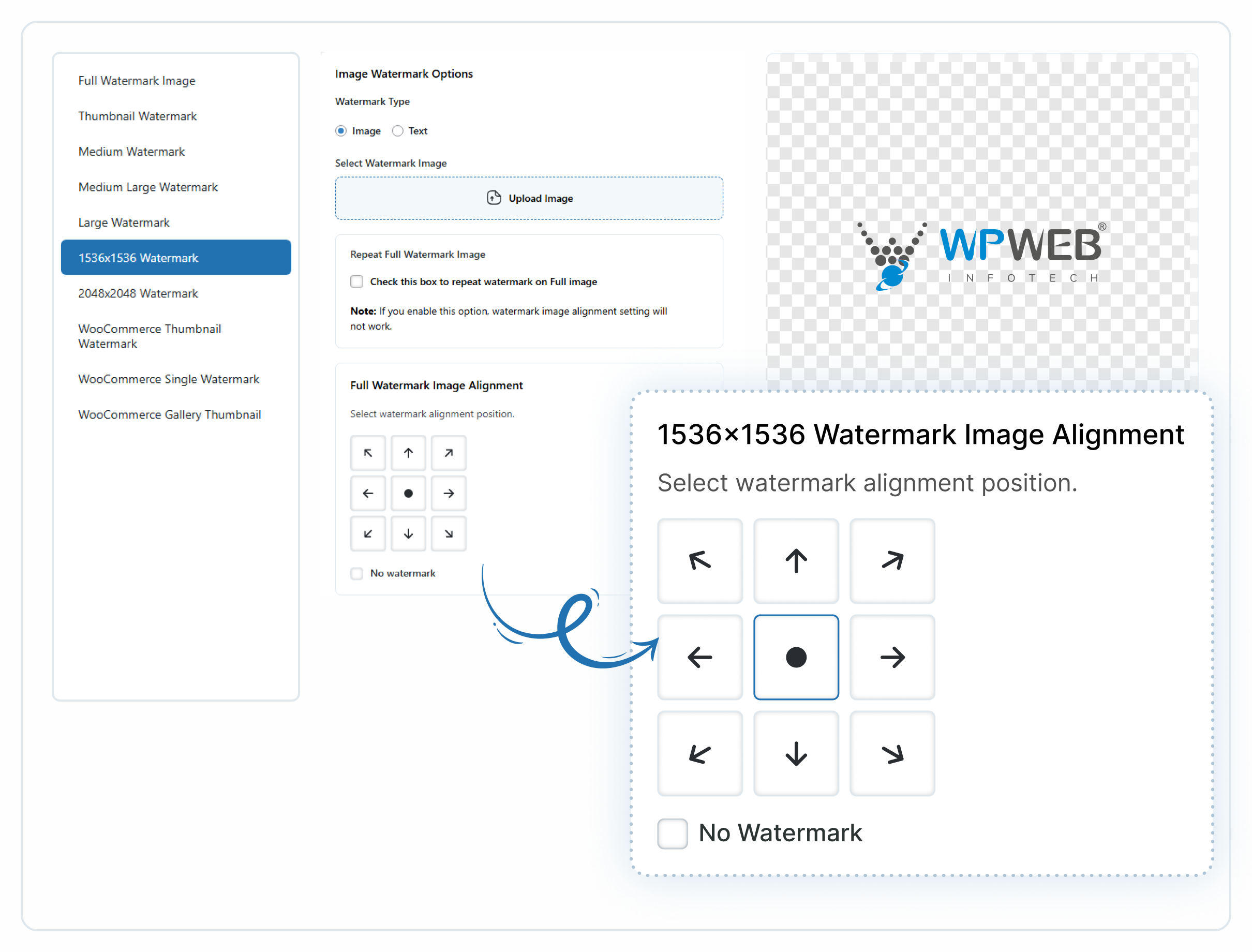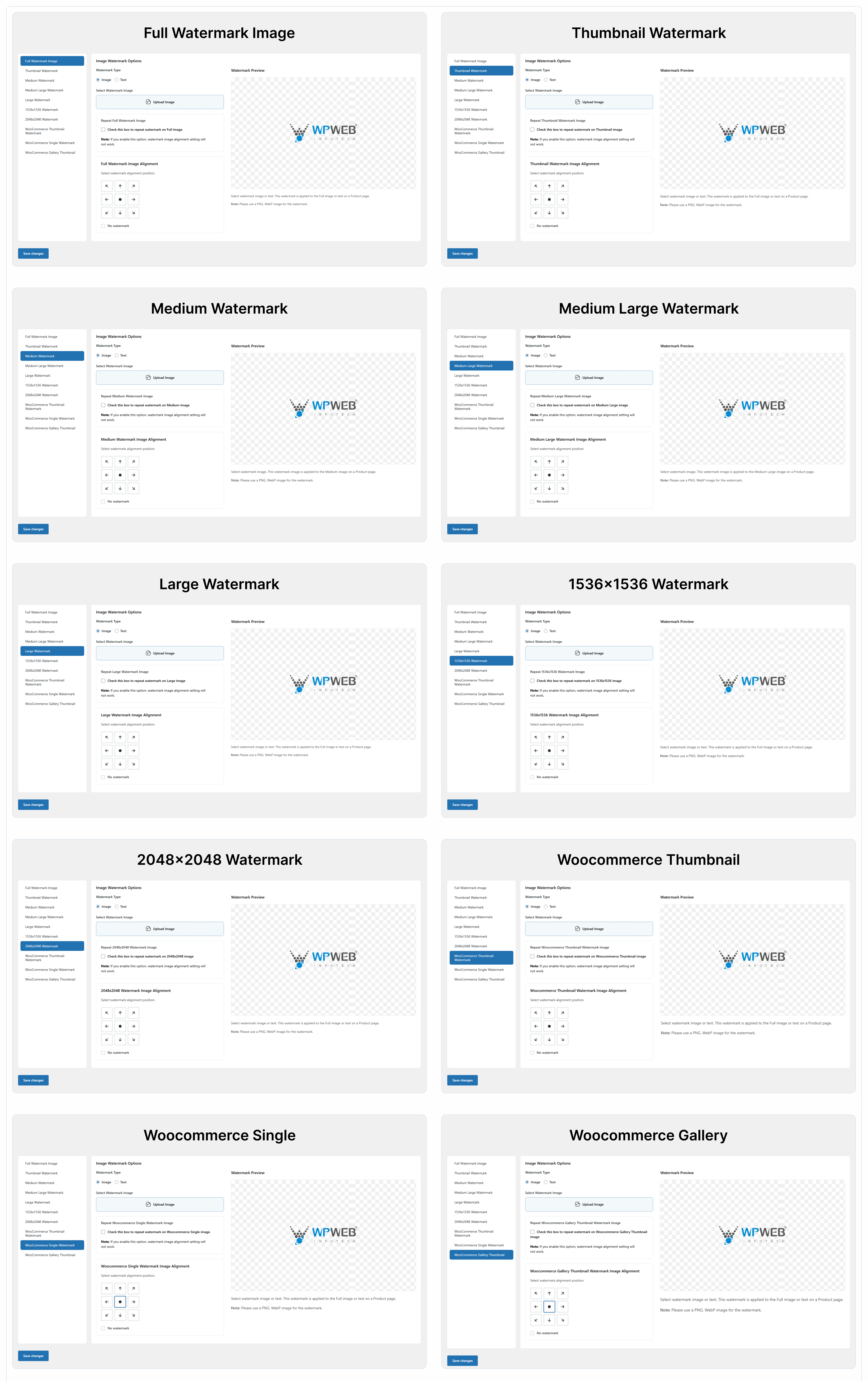 Product Image Watermark for Woo will add a new setting menu to the WooCommerce setting page with setting name “Download Image Watermark”. There you will be able to set the watermark image for each image sizes and set the position of watermark image.